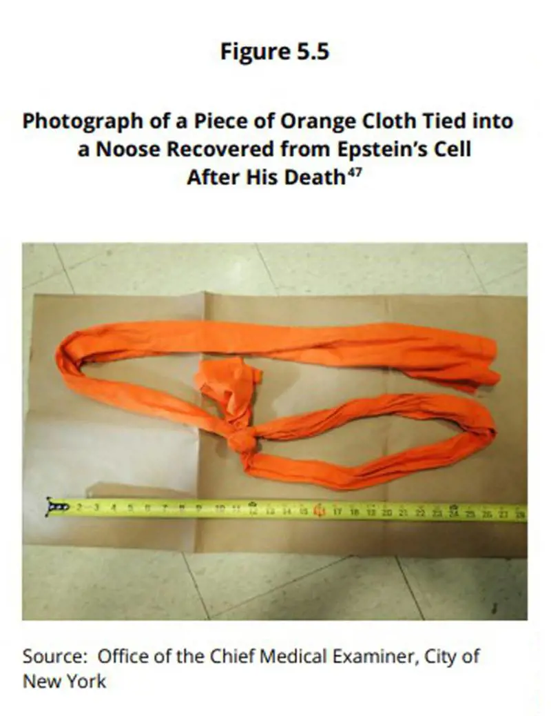 Una striscia di tessuto arancione, presumibilmente ricavata dalle lenzuola del carcere, ritrovata nella cella di Jeffrey Epstein al Metropolitan Correctional Center di Manhattan, diffusa dal Dipartimento alla Giustizia degli Stati Uniti d'America
