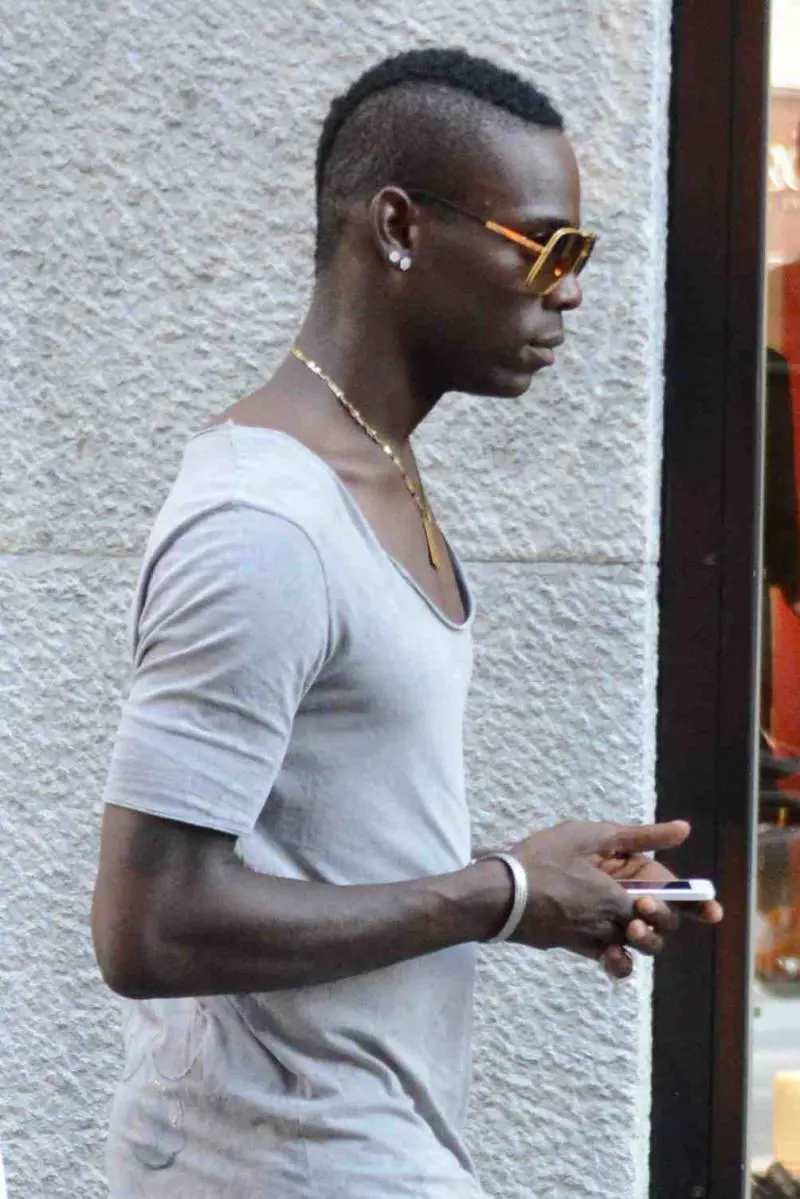 Mario Balotelli avvistato per le vie del centro di Milano mentre passeggia con un ragazzo e due telefoni. Si dirige alla sua Ferrari e alla multa per divieto di sosta lasciatagli dai vigili