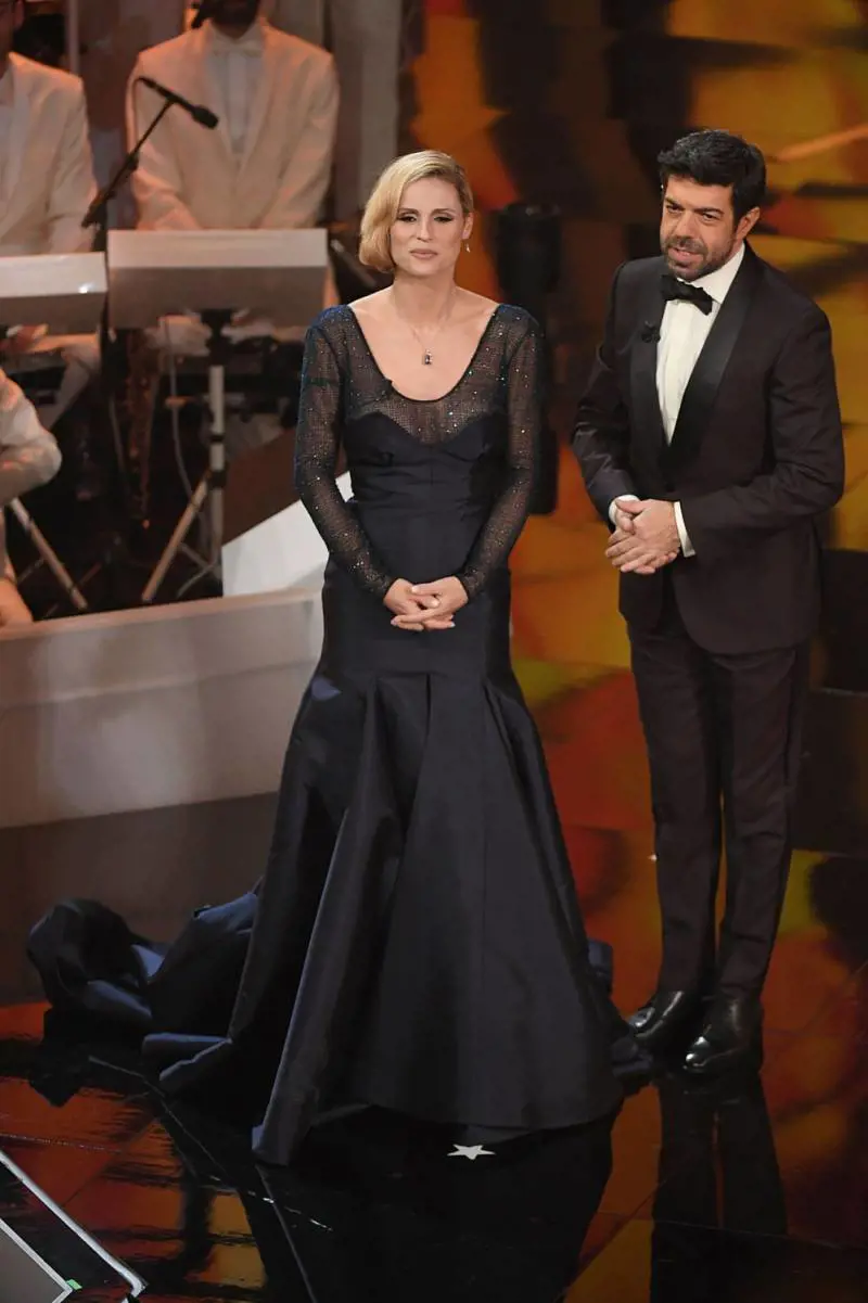 Michelle Hunziker, in un abito nero lungo e a sirena, con uno spacco sulle gambe, firmato da Trussardi, la casa di moda della famiglia del marito Tomaso.