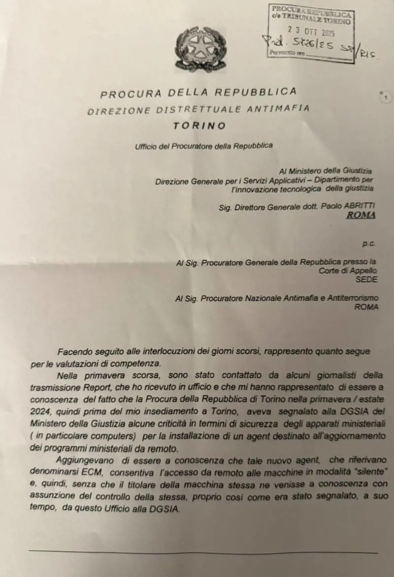 Ecco la missiva indirizzata al ministero con la quale il pm Giovanni Bombardieri si è sentito in dovere di chiedere informazioni dopo che i giornalisti di Report lo avevano avvisato della vulnerabilità del sistema utilizzato dia magistrati