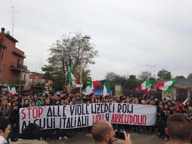 CasaPound e Blocco Studentesco protestano contro le violenze dei rom. L'onlus Arci Solidarietà ed Eureka: "Hanno impedito l'ingresso a scuola dei bambini e dei ragazzi del Villaggio attrezzato di Via Cesare Lombroso a Roma"