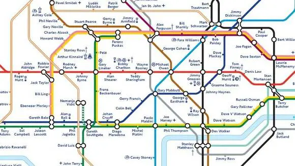 Per festeggiare i 150 anni della federazione calcistica londinese e i 150 anni della metropolitana londinese, è stata creata una speciale mappa londinese con i nomi dei grandi del calcio internazionale