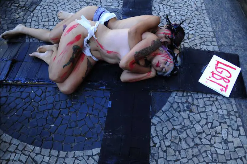 Singolare protesta, a Rio de Janeiro, poche ore prima del voto per le elezioni politiche e presidenziali brasiliane: due militanti del movimento femminista Bartardxs hanno manifestato seminude e legate a una croce di cartone davanti a Candelaria (un’importante chiesa cattolica nel centro cittadino) contro le dichiarazioni omofobe del candidato alla presidenza, Levy Fidelix. Il leader del Prtb aveva detto che i gay hanno "bisogno di cure psicologiche".