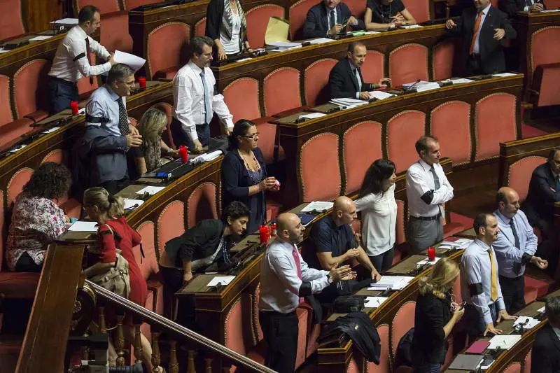 Lumini, lutti al braccio e manifesti funebri: così i grillini protestano in Senato contro il ddl scuola
