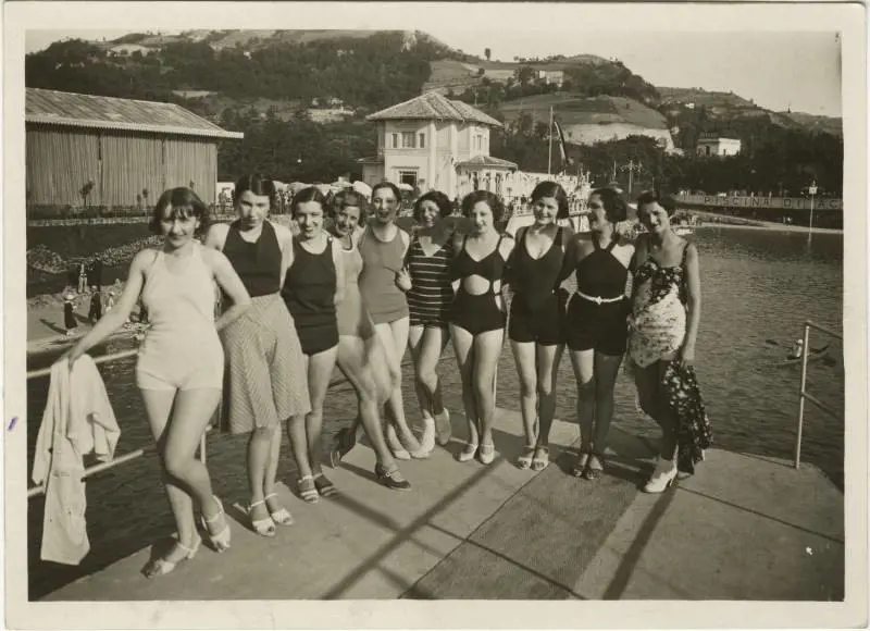 Ce n'è una più audace. Una porzione di pelle tra seno e ombelico si affaccia da una finestra rotonda ritagliata nel costume da bagno, è quasi un precursore del trikini. Ma il tessuto è pesante e faticherà ad asciugarsi dopo il tuffo in acqua, dalla piattaforma della piscina alle loro spalle. Umido e ostinato pizzicherà sulla pelle ancora bianca, su quel pallore steso da un anno di lavoro negli uffici o nelle fabbriche di città. Operaie, centraliniste, sarte, segretarie, domestiche a servizio, ereditiere e ben maritate. Tutte assieme e tutte uguali in posa per la foto sul trampolino di Acqui Terme: in costume, in abito, in gonna.