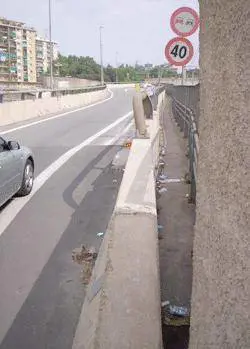 A distanza di sette mesi, siamo andati a vedere se qualcosa fosse cambiato. Macché. Il malcapitato pedone che voglia scendere a piedi dall'aeroporto fino a Sestri Ponente, dopo aver percorso un lungo marciapiede protetto ai lati da muri di cemento alti oltre il metro, finisce come un topo in trappola. Che fare? Tornare sui propri passi o scavalcare atleticamente quel non facile ostacolo in cemento, per poi sbucare tra il traffico di una strada dove le automobili sfrecciano a velocità elevate.
