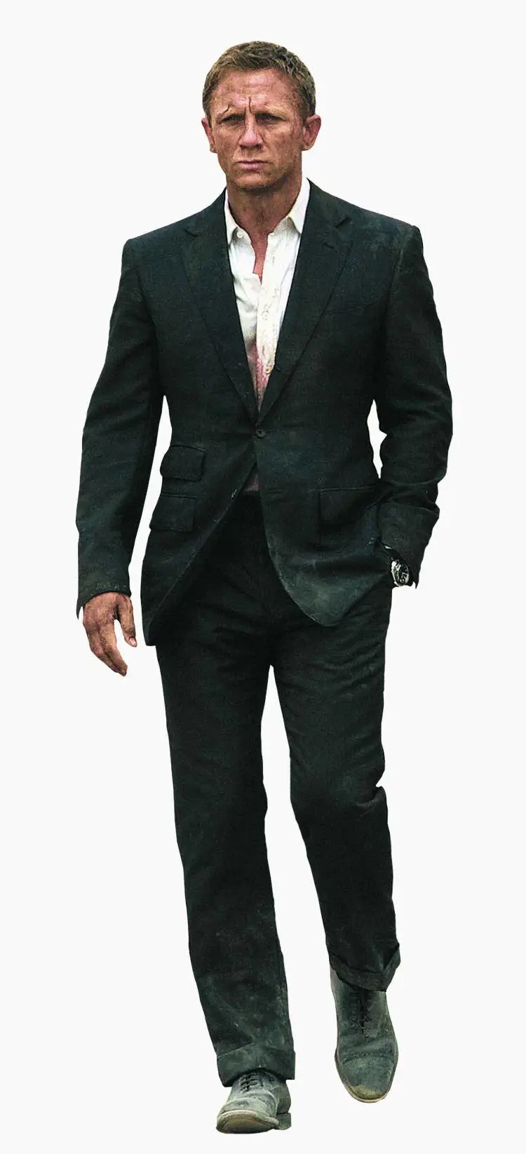 Fuori dal film, dov’è in look lurido-teppa, indossa pantaloni grigi, cardigan blu su camicia celeste e un paio di scarpe nere «Duilio» tirate a lucido. È tranquillo, ordinario e somiglia a Mike Bongiorno da giovane. «Nonostante le scene d’azione, non mi sono esposto a pericoli fisici: non facevo il coraggioso, per esibizionismo. Ho voluto imitare Buster Keaton e Chaplin: in scena, erano se stessi. Se il pubblico deve credere a me, devo buttarmi io. Difficile dire se somiglio al Bond di Fleming, che quando l’ha inventato correvano gli anni Cinquanta. Ho letto i suoi libri, ma cercando d’infondere la mia integrità al personaggio, confuso dai continui tradimenti. Amici e famiglia sono i miei valori più importanti. E cerco d’essere normale e di ricordare gli insegnamenti di mia madre Olivia, che m’ha iniziato al teatro al quale tornerò. Magari con opere moderne: nelle commedie classiche si parla troppo!», sorride Craig, padre di un’adolescente, mentre tiene fissi gli occhi d’acciaio.