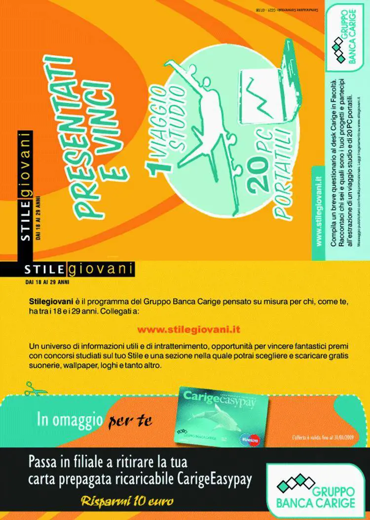 Per questo ha creato «Carige Stile Giovani», un insieme di soluzioni bancarie, finanziarie e assicurative, studiate specificamente per gli under 30, per aiutarli a realizzare i loro progetti di studio, casa, lavoro e tempo libero.