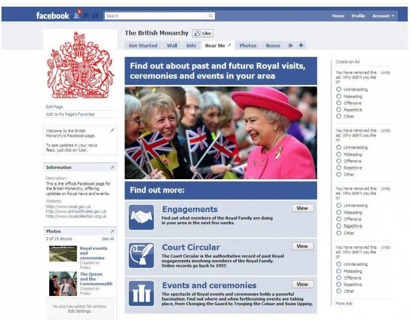 Ultima sovrana di uno dei più grandi imperi della storia ha dunque deciso di aprire una propria pagina, o meglio la pagina della monarchia britannica. Si chiamerà «The British Monarchy» e conterrà fotografie, video, notizie ma diventerà anche destinaria di commenti che chiunque potrà lasciare. Facebook ha poi creato appositamente l'applicazione «near me» per permettere ai fan di essere avvisati per tempo delle eventuali iniziative della casa reale britannica nello loro area di residenza. «Facebook - ha detto un collaboratore della regina al Daily Telegraph - è probabilmente l'ultimo bastione dei media sociali dove non è ancora presente la famiglia reale. E la regina si è impegnata a far parte appieno del XXI secolo. Tutti i progetti della pagina sono stati inviati ai piani alti di Buckingham Palace ed Elisabetta ne ha più o meno assunto il controllo».
