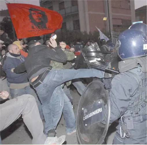 Per azione intenzionale o per eterogenesi dei fini, poche ore dopo il proclama sovversivo di Antonio Di Pietro, l’avanguardia più arrabbiata dei contestatori schierati attorno a Villa San Martino, tra i quali spiccavano anche esponenti dei centri sociali, dalle parole passava alle urla - «Arrestatelo!» - e dalle urla alla provocazione violenta, trasformando quella che fino a quel momento era una rumorosa e folkloristica manifestazione per chiedere le dimissioni del premier in un vero e dissennato assalto. Provocando così la reazione della polizia che, di fronte al lancio di vetri e pietre, ha risposto con manganellate e cariche di alleggerimento.
