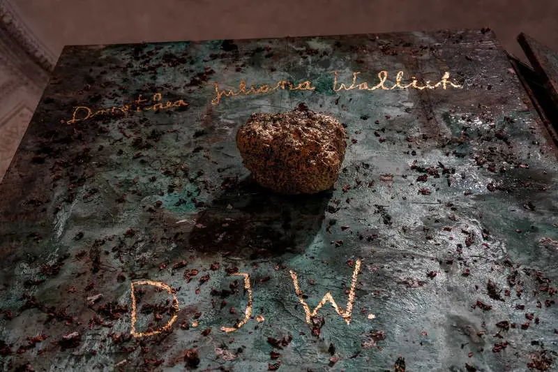 Alchimiste, così come altre opere di Kiefer, è l’equivalente di un ceffone alle nostre coscienze addormentate dalla volgarità del nichilismo prêt-à-porter, una roba poco impegnativa, tutto è uguale a tutto, e quindi non significa nulla, procediamo tranquilli dove ci portano lo shopping e il culto della tecnica. L’alchimia è una Grande opera, che va dalla putrefazione alla rinascita, dall’oscurità alla luce, dalla materia allo spirito, dal piombo all’oro. Ed è proprio questo che propone il percorso a Palazzo Reale. Nella sala delle Cariatidi assistiamo alla trasformazione, mediata dalla «scienziata» e madre, che porta al trionfo dorato della sala attigua. Tra i materiali utilizzati da Kiefer spiccano proprio i metalli e la cenere. La pietra filosofale, raffinata nel vas (il crogiolo) dell’alchimista, ha fatto il suo dovere. Nulla si perde, tutto rinasce, dopo essere passato attraverso la decomposizione. Ma la Grande opera è anche un’impresa spirituale che rispecchia il ciclo della vita. L’alchimista lavora su se stesso e il premio è l’ascesi spirituale. Il catalogo della mostra propone un saggio interessante di Gabriele Guercio: quanto c’è di cristiano in Kiefer? Tanto e poco assieme, verrebbe da rispondere. La figura di Maria è indubbiamente centrale nelle Alchimiste come altrove, ma Kiefer attribuisce forse maggiore importanza all’ebraismo (e alla cabala) e alle religioni orientali. Altro si può trovare in questa mostra: il tema della trasmissione del sapere, espresso dai famosi libri metallici di Kiefer.