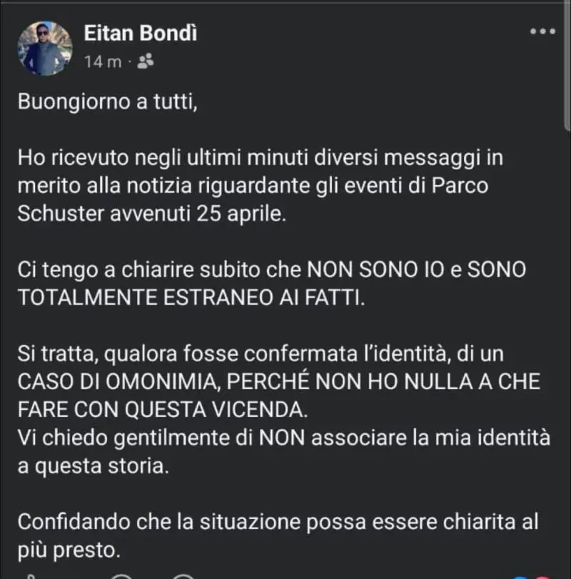 “Ho ricevuto negli ultimi minuti diversi messaggi in merito alla notizia riguardante gli eventi di Parco Schuster avvenuti 25 aprile – scrive il praticante legale di 28 anni Bondì - Ci tengo a chiarire subito che non sono io e sono totalmente estraneo ai fatti.