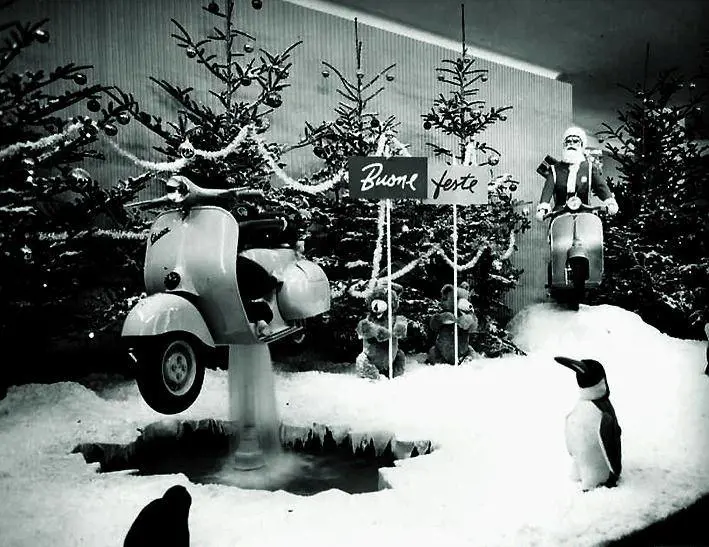 Ma durante quel trentennio, sotto Natale, la sede della Piaggio diventava meta di tutti i genovesi, perché era allestita una vetrina che, col passare degli anni, un po' come l'altrettanto celebre calendario, era diventata quello che oggi chiameremmo un «oggetto di cult». Andare a vedere la vetrina della Piaggio, magari dopo una puntata ai «baracconi» allora in piazza della Libertà, era il premio ai bambini ed era la curiosità degli adulti. Ce ne ha parlato il dr. Giuseppe Casarino, in quei tempi impiegato alle Realizzazioni Pubblicitarie della Piaggio, che, con Angelo Danovaro e Aldo Ferrante, fu uno degli ideatori di tante vetrine natalizie nel corso di quegli anni. Erano sfarzose nella scenografia, con grandi abeti natalizi, enormi papà Natale alti tre metri, pupazzi di neve realizzati con quintali di cotone. Un anno si poteva vedere la Vespa che miracolosamente si muoveva su un cavo d'acciaio, quasi un acrobata, oppure, l'anno successivo sempre la Vespa, sollevata da un getto d'acqua. Alla creatività dei pubblicitari, si integrava la tecnologia degli specialisti di Pontedera, che realizzavano i dispositivi per creare particolari effetti speciali, mentre era immancabile l'apporto dell'elettricista Traverso, dipendente Piaggio, per i colorati effetti di luce.