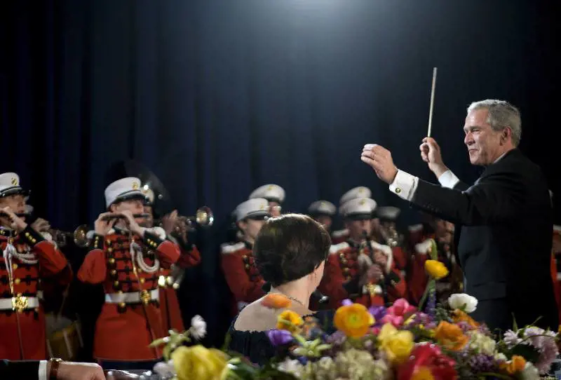 Bush ha diretto una marcetta durante l'annuale 'cena delle beffe', il gala organizzato dai giornalisti dell'Associazione dei corrispondenti alla Casa Bianca, che per tradizione fin dagli anni Venti del secolo scorso è un'occasione per il presidente e la stampa per prendersi in giro a vicenda. La banda era quella del corpo dei Marines, la stessa che giorni fa si è esibita sul prato della Casa Bianca per celebrare il compleanno di Papa Benedetto XVI.
