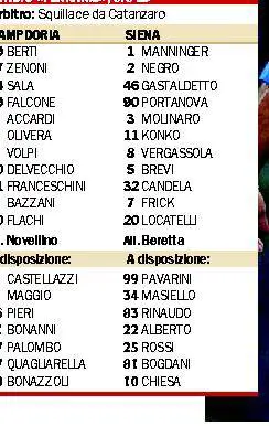 Per la prima volta dall'inizio della stagione Emiliano Bonazzoli non ci sarà. L'attaccante infatti è reduce da un affaticamento muscolare che lo ha condizionato nell'ultima gara di campionato contro il Messina e per Walter Novellino è arrivato il momento di cambiare. Ma la vera novità, questo pomeriggio contro il Siena, potrebbe essere l'ingresso in campo dal primo minuto di Fabio Bazzani, per struttura fisica e caratteristiche, uomo ideale dopo i giorni di pioggia che si sono abbattuti su Genova. Perché l'idea di schierare la coppia-fantasia Flachi-Quagliarella al tecnico blucerchiato, che intanto continua nel suo personale silenzio stampa, è anche venuta e lo strano ballottaggio Bazzani-Quagliarella è anche destinato a proseguire durante il match con una sorta di staffetta, quella classica di un tempo per uno: «Non so ancora se giocherò - spiega Bazzani - ma mi sono accorto che c'è questa possibilità, spero almeno di fare uno spezzone. Io comunque sto bene e a Palermo ho capito di essere tornato utile. Non mi sento di essere inferiore ai miei compagni, anche se ho sempre detto che la Sampdoria ha un attacco fortissimo». Vicino avrà il gemello Flachi: «Ho avuto momenti di difficoltà particolarmente lunghi e Francesco mi è sempre stato vicino. Tra noi c'è una vera amicizia. Tornare al gol? Lo baratterei volentieri con una vittoria contro il Siena che è sempre stata la nostra bestia nera».