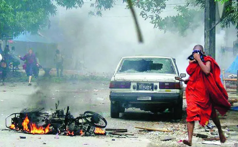 Cade il 50enne fotografo giapponese Kenji Nagai. Un soldato gli passa sopra, lo fulmina con un colpo alla tempia. Stramazzano al suolo, si spengono in un rantolo due monaci. Non sopravvivono sei civili colpiti mentre barcollano sotto le cariche assassine. Poi arriva l’ordine. Cercare i fotografi, stanare i giornalisti, sigillare lo sgocciolio dell’informazione. Dopo i templi tocca all’albergo Traders. Lo prendono d’assalto, lo setacciano camera per camera.