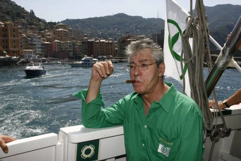 Ha la maglietta verde di rigore, con la scritta in bella vista: «Padania». Ma il berretto no, quello non riescono a farglielo tenere in testa, neanche quando il sole a picco, implacabile, della baia di San Fruttuoso di Camogli, a mezzogiorno in punto, sembra fiaccare la sua resistenza, nel momento in cui sale sull’imbarcazione della Lega nord Liguria. Lo aiutano a percorrere la scaletta che traballa, poi lo accompagnano all’interno cercando di evitare - missione impossibile - l’assalto della gente.
