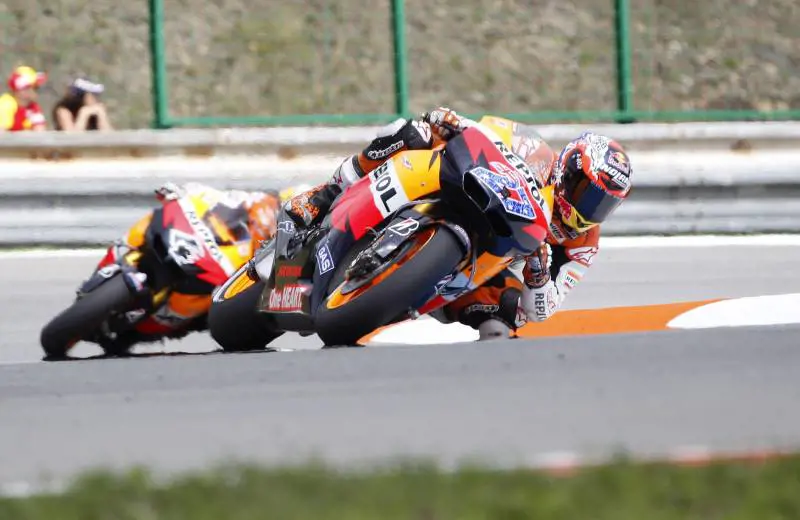 Con 218 punti, l’australiano consolida il primato nella classifica generale. Il margine sullo spagnolo Jorge Lorenzo sale a 32 punti: il campione del mondo, in sella alla Yamaha, deve accontentarsi del quarto posto. Alle sue spalle si piazza il suo compagno, lo statunitense Ben Spies, seguito dalla Ducati di Valentino Rossi, sesto e di fatto mai a contatto con i migliori. Va decisamente peggio la domenica di Dani Pedrosa. Lo spagnolo, scattato dalla pole position con la sua Honda Hrc, rovina tutto nel secondo giro. Il leader perde il controllo dell’anteriore e scivola fino a fermarsi nella ghiaia: gara finita. Stoner si ritrova al comando e prova ad allungare sugli inseguitori: la fuga decolla e il leader del Mondiale prende il largo accumulando oltre 5 secondi di vantaggio sui rivali. Alle spalle del capofila si infiamma la lotta per la seconda posizione. Dovizioso e Simoncelli passano Lorenzo e il trio si sgrana: i due italiani ipotecano le posizioni sul podio e tengono a bada l’iridato senza troppi problemi fino alla bandiera a scacchi.