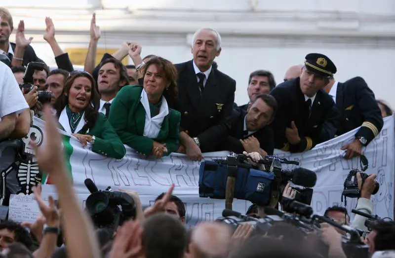 Nel capoluogo lombardo, i protagonisti della cosiddetta cordata italiana, lo stesso Roberto Colaninno, Marco Tronchetti Provera e l'ad in pectore Rocco Sabelli al loro arrivo a via Clerici sono stati contestati al grido di "Via la casta si riapre l'asta" e vivacemente apostrofati. "Meglio falliti che in mano a 'sti banditi'', "Piersilvio al ceck-in a 600 euro al mese", alcuni degli slogan scanditi. "E adesso tutti in treno", hanno gridato i dipendenti Alitalia. "Cai paga un'ora di volo a 1,85 euro. Cercasi marito per dividere le spese", era l'appello di una bionda hostess in sit in a Fiumicino. "Silvio non ci hai venduto ai francesi per svenderci ai tuoi amici", si leggeva sugli altri cartelli. Nemmeno la notizia dell'avvio dell' iter per la cassa integrazione da parte del commissario straordinario Augusto Fantozzi ha spento gli entusiasmi.