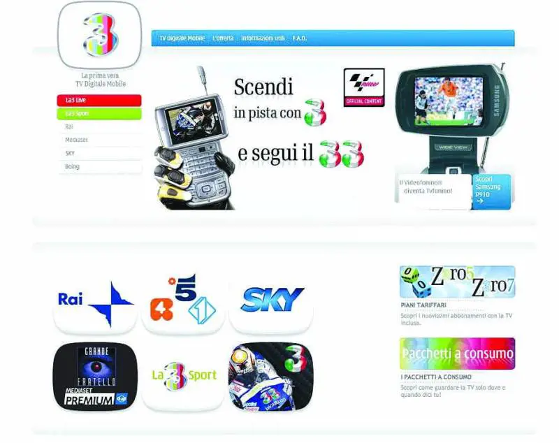 Tre, in particolare, prevede modalità distinte: una a consumo e due proposte in abbonamento. La prima con un'ampia gamma di offerte che spaziano da La3 a Sky, fino alle partite di calcio Mediaset Premium e, gratuiti, i canali Rai, il meglio di Mediaset e Boing. Il tutto ad uno costo che parte da un minimo di 3 euro al giorno, fino ad un forfait di 29 euro per tre mesi, con alcune offerte intermedie. Gli abbonamenti prevedono un canone di 29 euro mensili per il pacchetto Zero 5 e di 49 euro per il pacchetto Zero 7. Entrambi includono, oltre allofferta Tv, anche un piano chiamate e videochiamate. Lofferta Tim Tv, gratuita fino al 30 giugno consente invece di vedere i canali generalisti: Canale 5, Italia 1, La7, Mtv e Sport Italia e i canali Premium Sky. Inoltre, il Campionato di Calcio Serie A, le partite interne della Juventus e il meglio del Calcio Europeo fino alla fine della Stagione 2006/2007. Successivamente il costo del canone sarà di 5 euro al mese comprendente la visione dei canali generalisti gratuiti e dei canali Premium secondo le offerte disponibili al momento. Vodafone propone il meglio della programmazione Sky in modi diversi.