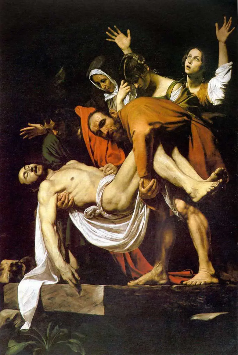 No, guardando alla posizione trasversale del corpo rispetto alla pietra, e a come i personaggi disposti a ventaglio si addossino in pochissimo spazio al margine di una sorta di baratro, si intuisce che Caravaggio, scelto un angolo di visuale ribassato, ha deciso di rappresentare proprio il momento in cui la salma viene calata nella fossa. Lo slittamento laterale dell’inquadratura, con il possibile spostamento del cavalletto dell’artista all’ultimo momento, è provato indirettamente anche dal fatto che Rubens, nel copiare l’opera, ha spostato in avanti e all’esterno Giuseppe d’Arimatea, accorgendosi che i pesi compositivi erano sbilanciati, e il corpo di Cristo sembrava quasi fuggire alla presa del discepolo.