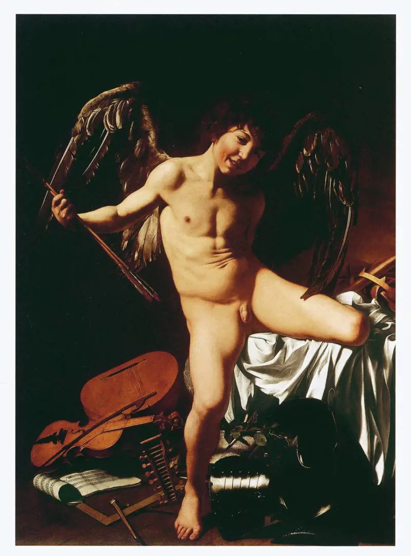In verità, Caravaggio appena arrivato dalla Lombardia è ancora contemplativo, apollineo, ideale, come si vede in quel capolavoro, dipinto a 22-23 anni, che è il Riposo durante la fuga in Egitto (proveniente dalla galleria Doria Pamphilj). Qui la realtà è intermittente rispetto a un sogno: la si trova nell’occhio dell’asino, nelle masserizie di San Giuseppe, nei sassi e nelle foglie. Tutto il resto è sogno, con una musica celeste che arriva alle nostre orecchie. D’altra parte gli strumenti musicali ritorneranno in numerose altre opere di Caravaggio. Dal Suonatore dell’Ermitage all’Amore vincitore di Berlino. Il rapporto con il reale di Caravaggio è tale che non avvertiamo la differenza tra soggetti profani e soggetti religiosi. Possiamo dire che egli raggiunge se stesso abbastanza presto, ne I bari ora al Kimbal Art Museum di Forth Worth da cui subito si passa al pingue Bacco degli Uffizi, immagine sgradevole quanto ammirata: quando mai un ciccione sgraziato è stato rappresentato così solennemente?
