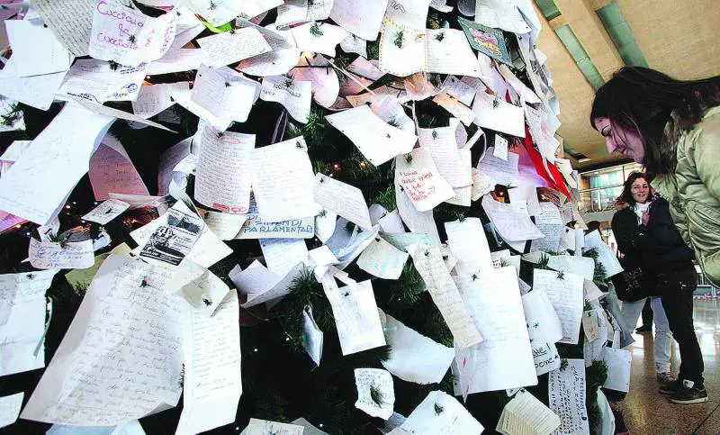 Ogni giorno frotte di curiosi si fermano davanti a questo collage che cresce spontaneo mano a mano che si avvicina la sera della vigilia. Un insieme di pezzi di carta riciclati (ricevute, biglietti di treno usati, fogli strappati alla svelta da un quaderno) su cui in molti hanno voluto lasciare una traccia del loro passaggio. Una moda, questa, nata nel 2005, quando una senzatetto attaccò allalbero un biglietto in cui denunciava il rumore che le impediva di dormire nella sua casa di cartone. Da allora cè stata uninvasione di messaggi. Si è andato così consolidando un fenomeno che, per entità, la dice lunga sulla magia del Natale.