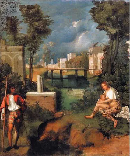 In realtà il mistero della Tempesta si è molto diradato, se non dissolto, negli ultimi anni; e non è infondato ridurlo alla giusta e semplice definizione del primo che la vide e ne registrò memoria, Marco Antonio Michiel nel 1530 a soli vent’anni dalla morte dell’artista: "el paeseto in tela cum la tempesta, cum la cingana et soldato, fu de mano de Zorzi da Castelfranco". La prima fotografia, il lampo nel cielo colto nell’istante in cui appare, rendono luminose e spettrali le architetture sul fondo. Un fulmine, l’avviso della tempesta imminente, in una città che non è difficile identificare nella stessa Castelfranco, subito di là del ponte di legno. Da molto tempo penso che la lettura più pertinente sia proprio quella impressionistica, che fa riferimento alla "tempesta", la cui evidenza meteorologica ha lo stesso peso dei due umani protagonisti. Il fulmine nel cielo nuvoloso sopra la città, quel lampo di luce strisciante sulle case è il tema sostanziale ed è colto con la stessa velocità nel tempo in cui si manifesta: un’istantanea fotografica che corrisponde al «momento decisivo» evocato da Cartier Bresson, in contraddizione con l’atteggiamento "in posa", quasi per evidenziare il contrasto, dei due personaggi. Paesaggio puro dunque, ma in un momento determinato, in cui la nostra attenzione è improvvisamente destata da quella irruzione imprevedibile e aleatoria che rappresenta la vera, sostanziale originalità di quella veduta. In quel "puro" paesaggio vi sono, senza significati allegorici, un soldato e una zingara. Niente di più che un soldato e una zingara.
