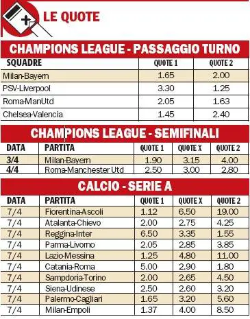 I rossoneri sono a 1.65 nel passaggio del turno con il Bayern (2), i giallorossi a 2.05 con il Manchester (1.63). Stasera la squadra di Ancelotti è a 1.90 contro il 4 dei bavaresi; domani all’Olimpico Totti e C. sono a 2.50 contro il 2.80 degli inglesi Tre nuove scommesse in serie A
