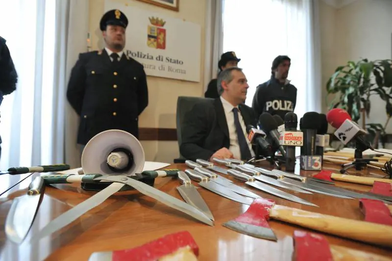 L'arsenale sequestrato Accette, coltelli, molotov, petardi seghe e mazze. Armi con le quali alcuni ultras si preparavano al colpire scatenando una "guerra" tra tifoserie. E oggi è stato il dirigente della Digos di Roma, Lamberto Giannini, a tracciare il riepilogo di una notte che nulla ha a che vedere con lo sport. Le armi "bianche", sono state sequestrate dalla Digos in tre diverse operazioni, già cominciate nei giorni scorsi. E durante il match di ieri, attirati da un antifurto bloccavolante che aveva l’aspetto di una mazza, la polizia ha trovato armi nascoste in una Kia parcheggiata nei pressi dell’ingresso della curva nord all’Olimpico. All’interno di una sacca c’erano decine di coltelli, mazze, martelli, accette, guanti, seghe e abiti che sarebbero stati utilizzati all’occorrenza per cambiarsi e dileguarsi dopo gli scontri.