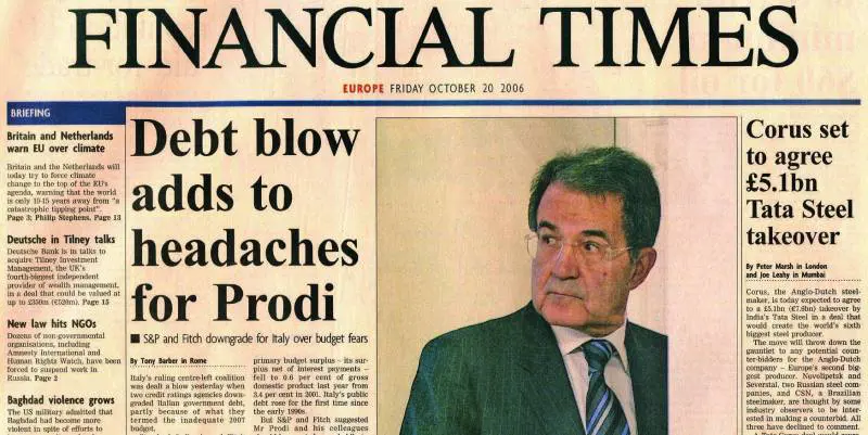 Campeggia il Professore - in foto, titolo e testo - sulla prima pagina rosa-arancio del Financial Times: «La bastonata sul debito si aggiunge ai mal di testa di Prodi», titola il quotidiano della City londinese. E nellarticolo si ricorda che «la legge finanziaria è stata criticata dagli industriali, dalle piccole imprese, dalla Banca dItalia, dagli economisti favorevoli alle riforme e da molti altri, ai quali adesso si aggiungono Fitch e Standard & Poors». Per adesso, aggiunge il Ft, il declassamento avrà un impatto «praticamente nullo» nella capacità dellItalia di onorare il debito, in quanto membro delleurozona; ma «avvicina lItalia al rating di A- che la Banca centrale europea - ricorda il giornale - pone come soglia per accettare i titoli di Stato come garanzia per le sue operazioni di rifinanziamento».