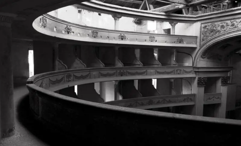 Dall'ombra gradualmente prende forma un leggio malandato, poi un bicchiere lasciato lì chissà quando, dei tendaggi, immobili su un palcoscenico calcato e poi dimenticato per trent'anni o forse più. Arriva un raggio di luce che attraverso una sottile nube di pulviscolo mette a nudo le linee degli scranni, dei tramezzi, delle barcacce.