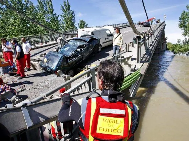 San Rocco al Porto (Lo) La pioggia e l’ondata di piena del Po hanno rischiato di fare una strage. Sono le 12.34 di ieri: la prima campata sul fiume Po dello storico ponte che collega la Lombardia con l'Emilia Romagna lungo la strada statale 9, nel Lodigiano, all’improvviso cede come un ramo spezzato. Si spacca in due, e si affloscia nell’acqua melmosa. In quel momento, all'altezza della golena di San Rocco al Porto stanno passando tre auto e un furgoncino: un Doblò Fiat, un'Alfa 159, una Fiat Punto e una Matiz Daewoo. Per le macchine è come scalare uno scivolo, le ruote pattinano, il freno a mano non basta: mezzi e conducenti precipitano nel fiume. Attimi di terrore. Il caso, e tanta buona sorte nella sfortuna limiteranno i danni: solo un paio di feriti, uno grave ma non in pericolo di vita. Quasi incolumi altri due automobilisti.