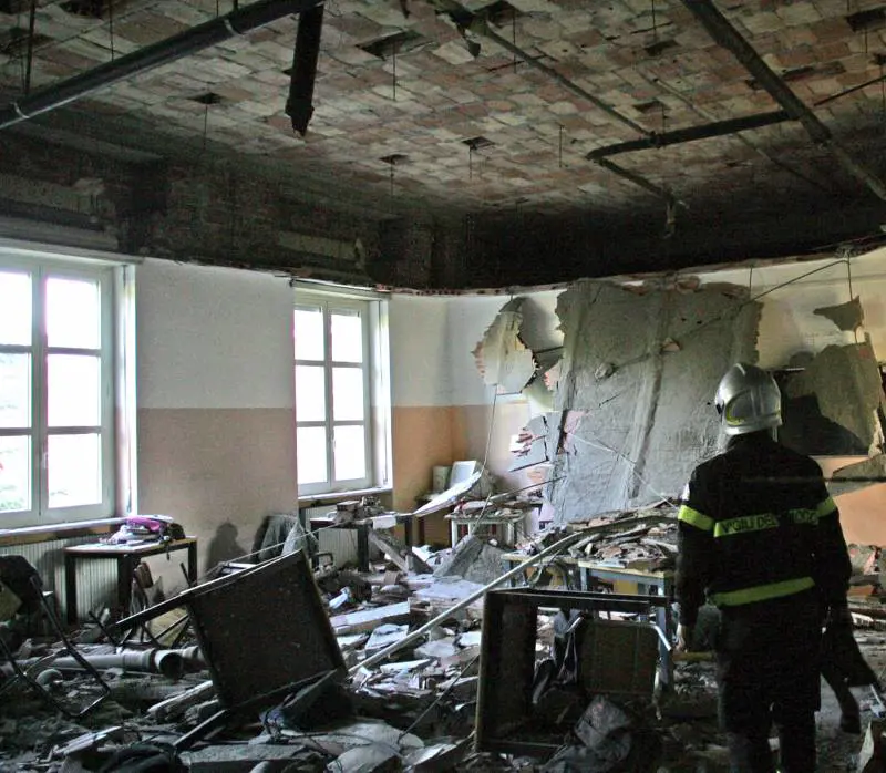 In IV G, al secondo piano, i ragazzi sono quasi tutti ai loro posto. Prima un sussulto per lo sbattere della porta poi il colpo sordo e il soffitto che crolla e si schianta sul pavimento travolgendo banchi, sedie e studenti. Passano lunghi e interminabili istanti prima che si riesca a mettere a fuoco quanto è accaduto. Alcuni corrono fuori nei corridoi, hanno il viso sporco di polvere bianca e calcinacci nei capelli. Gridano e gli occhi lacrimano. Pensano al terremoto. Arrivano altri studenti, i professori.