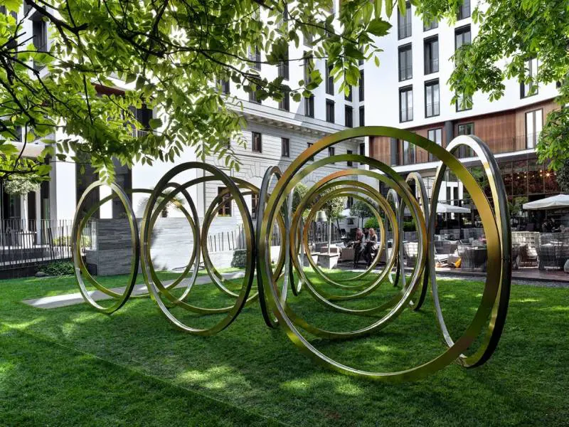 Martedì 12 aprile, in occasione di Milan Design Week 2016, Bulgari ha presentato con un party organizzato nello splendido giardino del Bulgari Hotel di via privata Fratelli Gabba 7 un'installazione artistica dedicata alla sua iconica collezione B.zero1 - divenuta famosa per quella particolare creazione a spirale che ha reso inconfondibile la sua linea e il suo brand. Il leggendario anello in oro, un capolavoro realizzato dallo studio di architettura NaNA, sarà il protagonista nei giardini di Bulgari Hotel Milano fino al 17 aprile. La struttura è composta da tre materiali, tre passaggi e le tre tonalità di oro che definiscono i gioielli B.zero1 di quest'anno (il magico numero tre, che ha caratterizzato la nascita dell’anello B.zero1 Perfect Mistake). Realizzato con 18 anelli in acciaio uniti insieme in una forma triangolare, ogni anello di tre metri di larghezza è disposto in modo da dar vita a una galleria che rivela una vista sul giardino dell’hotel. Spirali simmetriche formano geometrie perfette, l'installazione B.zero1 crea un gioco di riflessi d’oro che cambia seguendo le diverse angolazioni. Il triangolo con la sua forma perfetta è un simbolo della geometria fondamentale, interamente ispirato alle architetture di Roma. La sua sua struttura è un vero capolavoro di progettazione sinuosa: il tutto diviene una metafora dell'architettura dei gioielli. Durante il giorno, l'installazione riflette un florido ambiente romano con i suoi anelli rifiniti in oro che incorniciano il giardino come specchi magici; contemporaneamente il loro colore brillante ricorda la prima creazione B.zero1, in oro giallo. Mentre il sole tramonta, gli anelli riverberano i colori creando una insolita spirale di luce dorata. Questi anelli luminosi richiamano le sfavillanti sfumature delle fontane romane durante la notte e catturano l'anima luminosa del tricolore della collezione B.
