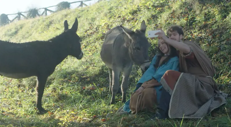 Nel primo filmato (guarda) si vede Maria cercare su una applicazione per incontri online il suo Giuseppe, di mestiere falegname. Dopo selfie e camminate sui prati, arriva il primo bacio. Effusione a cui segue l'immediata gravidanza della giovane ragazza, come se il figlio di Dio fosse stato calato dall'alto e non annunciato da un angelo. "Una giovane coppia, un bambino in arrivo e una casa da cercare", si legge nelle slide finali che lanciano il film promozionale a puntate dal titolo "Oh my God".