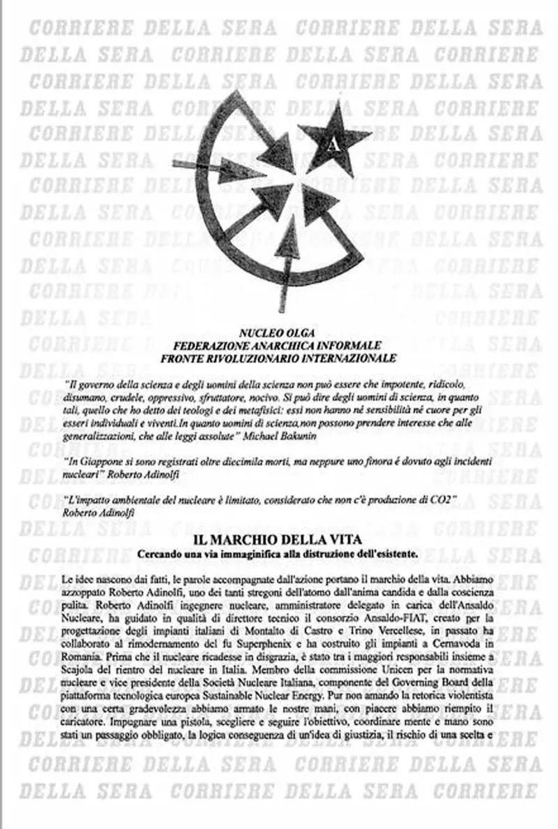 Il lungo testo recapitato al Corriere della Sera, intitolato Il marchio della vita, propone una "campagna di lotta contro Finmeccanica, piovra assassina", che ha il via con il ferimento di Adinolfi. "Oggi l'Ansaldo nucleare, domani un altro dei suoi tentacoli", scrivono gli anarchici, che rivendicano: "Abbiamo azzoppato Roberto Adinolfi, uno dei tanti stregoni dell'atomo dall'anima candida e dalla coscienza pulita". E invitano "tutti i gruppi e i singoli Fai a colpire con ogni mezzo necessario".