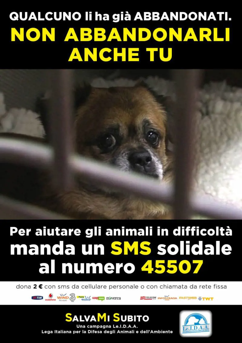 Basta un sms per aiutare i nostri amici animali. Si chiama "SMS-Salvami Subito", la campagna promossa dalla LeIDAA (Lega italiana per la difesa degli animali e dell'ambiente onlus) per contribuire alla prevenzione dell'abbandono, alla lotta contro il randagismo, all'azione diretta di ricovero, cura e gestione degli animali maltrattati e abbandonati. Dal 1 al 20 giugno sarà possibile donare 2 euro con ciascun sms solidale inviato da cellulare al numero 45507 o o con ogni chiamata da fisso allo stesso numero.