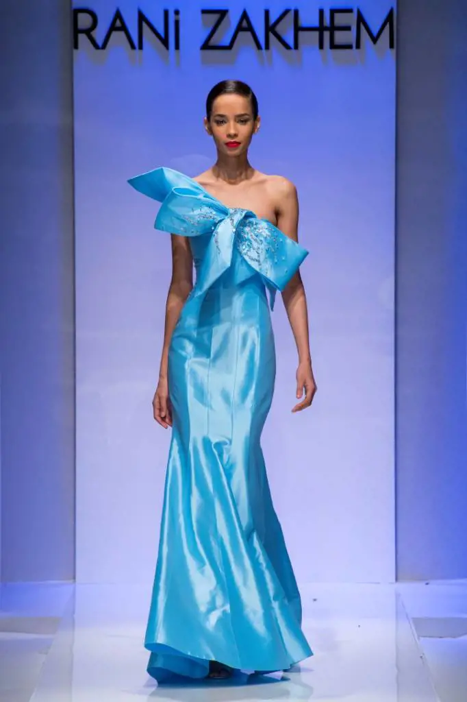 Abiti per un gran ballo quelli dello stilista libanese, cresciuto fra il Kenia e New York, Rani Zakhem: lunghe gonne svolazzanti dalla linea a sirena, fiocchi giganti, scintillanti ricami di pietre come gocce di brina, stelle marine e fiori. Una collezione omaggio al glamour di New York, con l’euforia degli anni ’60 e lo sfarzo degli anni ’80.