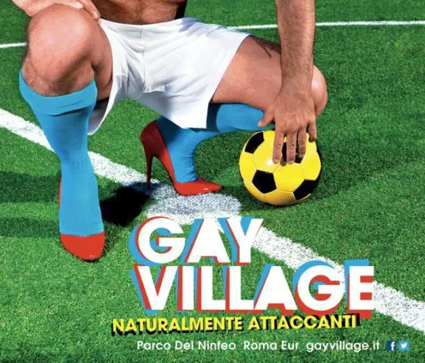 Sullo sfondo un campo da calcio. In primo piano i calzettoni azzurri e i pantaloncini bianchi. A tener fermo il pallone un paio di tacchi a spillo rossi. E lo slogan "Naturalmente attaccanti". È questa la campagna per il "Gay Village" del 2012. "Ogni anno cerchiamo di realizzare campagne di comunicazione che stupiscano - ha spiegato il creatore Gian Marco Sandri - in questo caso ho accostato due mondi apparentemente distanti: il mondo del calcio e quello omosessuale nei loro stereotipi". Gli organizzatori hanno, infatti, colto l'occasione per ritar nuovamente in ballo Cassano, nonostante l'attaccante azzurro avesse già bollato la sua dichiarazione come una semplice battuta.