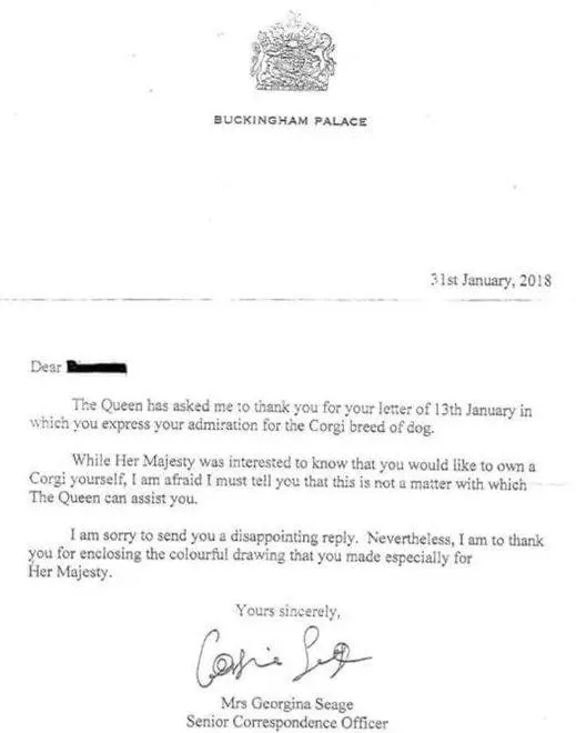razza Corgi, ma sono dispiaciuta nel dirti che Sua Maestà non potrà soddisfare la tua richiesta, regalandoti uno dei suoi cani, ad ogni modo ti ringrazia molto per il bellissimo disegno colorato che le hai donato".