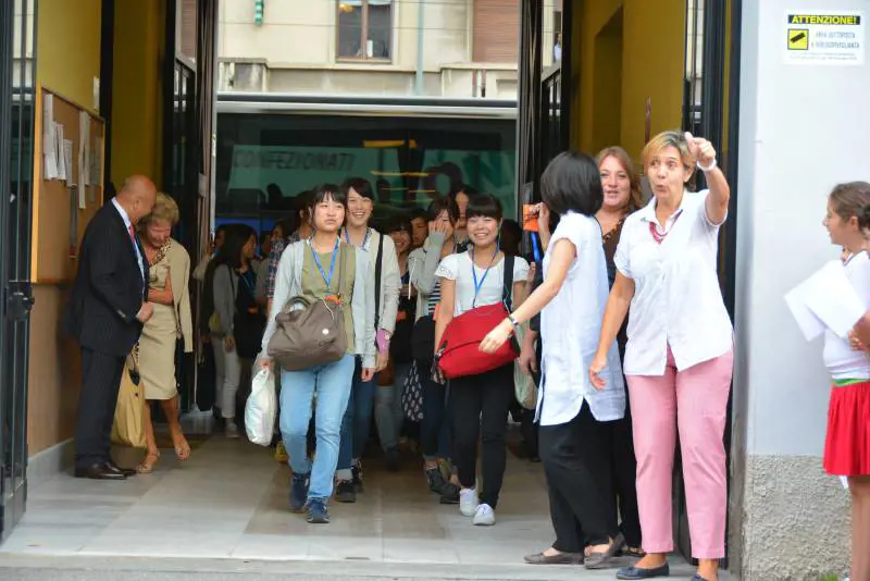 Giovedì 17 settembre, per il quinto anno, la scuola Maria Consolatrice di viale Corsica a Milano ha vissuto un’intera giornata assieme ad alcuni amici provenienti dal paese del Sol Levante. I bambini della scuola, vestiti per l’occasione in bianco e rosso, li attendevano da giorni. Quella mattina i bimbi hanno accolto le trentotto studentesse giapponesi, accompagnate da quattro docenti e dal rettore dell’università Hiroyuki Yamamoto, sventolando le bandiere del Giappone.