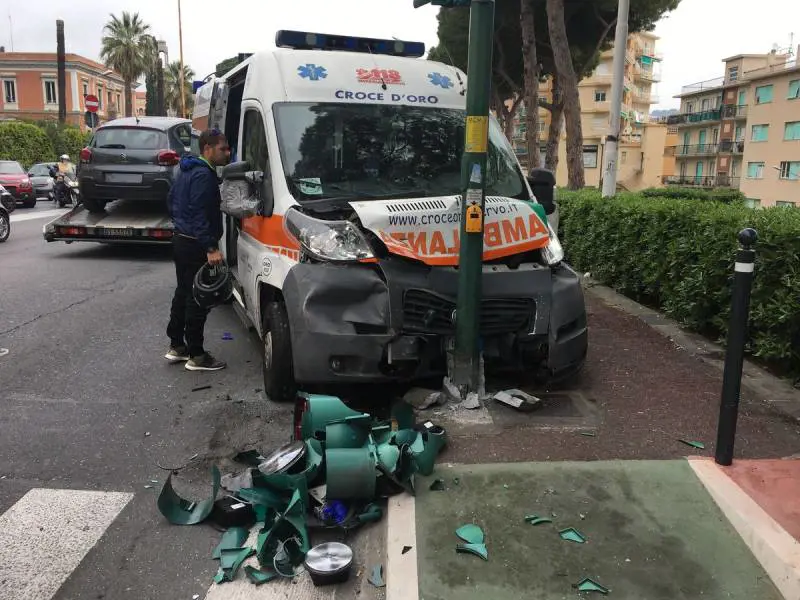 Imperia - Un'ambulanza della Croce d'Oro di Imperia, che stava viaggiando in sirena, si è schiantata, stamani, contro il palo di un semaforo, all'altezza di via Matteotti, sull'Aurelia, a Imperia, probabilmente nel tentativo di schivare una vettura Alfa Romeo "Mito", che si era immessa sulla via principale e che, a sua volta, è andata a finire contro una siepe, al bordo del marciapiede. Feriti, in modo serio, due dei tre occupanti della lettiga: il conducente e una milite che viaggiava al suo fianco, i quali hanno riportato contusioni e sospette fratture. Lesioni più lievi, invece, per l'automobilista.