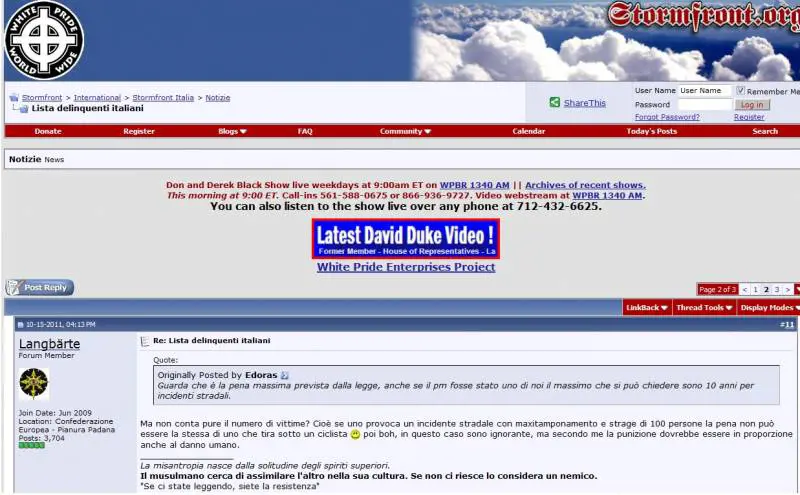 org/forum/f148, Diego Masi e Luca Ciampaglia, moderatori del forum, e Mirko Viola, utente del forum particolarmente attivo nella pubblicazione di post "tematici". Il processo relativo alla prima indagine si è concluso, per i quattro arrestati, con la condanna a pene che variano da 3 anni a 2 anni e 6 mesi di reclusione.Odio razziale in Rete, ritorna Stormfront. Perquisizioni in tutta Italia