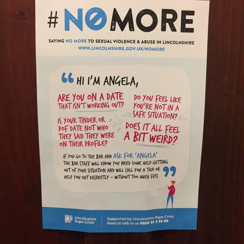 Si tratta di una nuova iniziativa contro le violenze sessuali lanciata a Lincolnshire, in Inghilterra. Angela non è altro che un nome in codice per far capire al personale del locale che aderisce alla campagna che qualcosa non va e che si ha bisogno di aiuto per cavarsi d'impiccio. Baristi e camerieri - debitamente istruiti - potranno quindi chiamare un taxi o permettere chi lancia l'sos a uscire da situazioni spiacevoli con discrezione. In caso di necessità potranno anche allertare le forze dell'ordine.