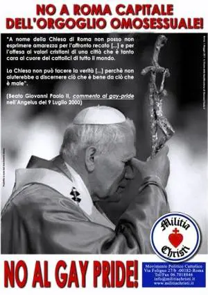 Il Gay Pride arriva a Roma e sulle strade del percorso appaiono manifesti per dire "no a Roma Capitale dell’orgoglio omosessuale". A corredare la scritta c'è la foto di Giovanni Paolo II. I manifesti sono stati affissi dal movimento politico cattolico Militia Christi, che cita le parole che Wojitila pronunciò nel 2000 proprio in occasione della manifestazione: "A nome della Chiesa di Roma non posso non esprimere amarezza per l’affronto recato [...] e per l’offesa ai valori cristiani di una città che è tanto cara al cuore dei cattolici di tutto il mondo. La Chiesa non può tacere la Verità [...] perchè non aiuterebbe a discernere ciò che è bene da ciò che è male".