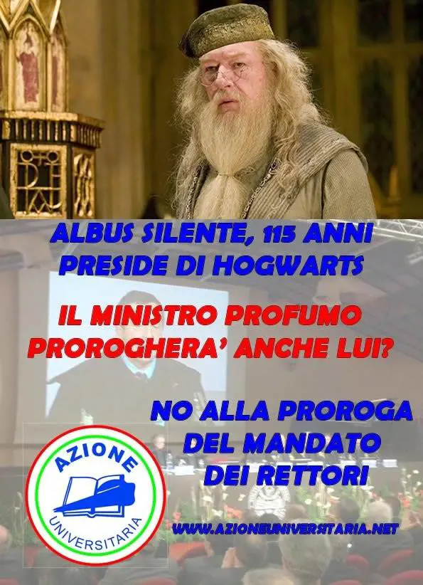 Rettori immortali, praticamente degli highlanders. Come Albus Silente che nei romanzi di Harry Potter regge Hogwarts da oltre cent'anni.Gli studenti ci scherzano sopra, diramando in rete la foto di Silente, ma la questione invee è seria, serissima. Sembra proprio infatti che il ministro dell'Istruzione, Francesco Profumo, sia deciso a fare carta straccia delle riforma dell'università firmata dal suo predecessore, Mariastella Gelmini, almeno in quella parte che non prevede proroga per il mandato dei rettori in carica.