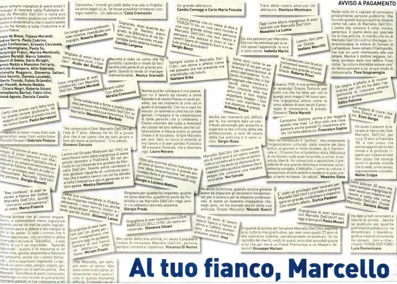 "A firmare i messaggi di sostegno è soprattutto chi ha lavorato con Dell’Utri a Publitalia ’80 o alle attività culturali ed editoriali, dalla Fondazione biblioteca di via del Senato al settimanale Il Domenicale", si legge in un'altra pagina, "Da Niccolò Querci, consigliere Mediaset e vicepresidente di Publitalia ’80, assistente di Silvio Berlusconi negli anni Novanta, ad Alessandro Salem, direttore generale dei contenuti Mediaset e braccio destro di Pier Silvio Berlusconi. L’ex direttore del Domenicale, Angelo Crespi, lo ringrazia come editore, mentre altri ricordano conversazioni e interventi alla biblioteca di via Senato".