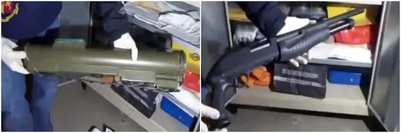 Tra le armi sequestrate figurano: pistole mitragliatrici con relativi caricatori, due fucili a pompa; addirittura un lanciarazzi pronto all'uso, un fucile a canne mozze con due cartucce in canna, un fucile mitragliatore completo di due caricatori e un silenziatore, tre pistole 'a penna' monocolpo; varie pistole e revolver con il colpo in canna, munizioni, due bombe a mano, una di fabbricazione italiana e l'altra Jugoslava, due manufatti di fattura artigianale contenenti presumibilmente materiale pirotecnico con fuoriuscita di spezzone di miccia a lenta combustione.