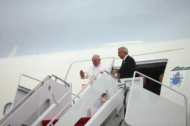 Francesco li saluta tutti prima di partire e, dato che viaggia in una normale poltrona di prima, i reporter possono vedere lo zucchetto bianco del pontefice che sporge dalla poltrona durante il viaggio.Si unisce alla comitiva del Papa anche un dipendente del Vaticano, ogni volta diverso scelto tra gli impiegati laici. Questa volta la scelta è caduta su Valentina Ambrosi, un’artista del mosaico.